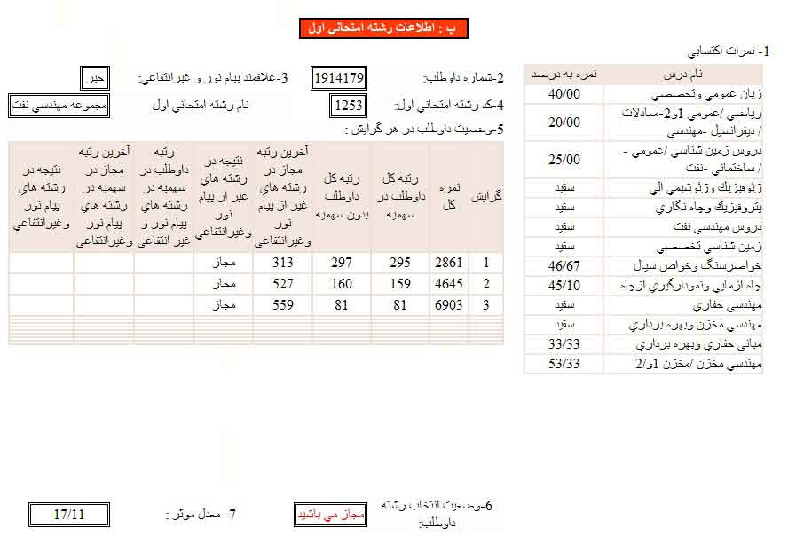 این هم از کارنامه دو تا از عزیزان که لطف کردند و کارنامه خودشون رو برای ارائه به دوستان داوطلب شرکت در آزمون کارشناسی ارشد مهندسی نفت ۱۳۹۲، در اختیار بنده قرار دادند... اگر با درنظر گرفتن شرایط و استرس سرجلسه آزمون، به درصدهای این دوست عزیزمون توجه کنید، متوجه صحبت های من در ارتباط با از دست ندادن فرصت ها و استفاده از زمان برای شروع مطالعات خودتون خواهید شد... بویژه دوست عزیزمون آقای حیران! (اسم مستعار در نظرات همین پست) و داوطلبینی که رقابت رو ساده می پندارند... بین ۳۰۰۰ نفر زیر ۱۰۰ شدن چندان هم ساده نیست... بیشتر فکر کنید...